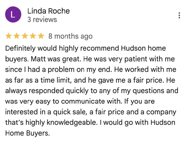 - Sell for cash to Hudson Home Buyers: Avoid all of the hassles with listing on the market, pick your closing date, no obligation to see our offer, no need to do repairs, and we LOVE the most difficult situations agents or other investors won’t touch.